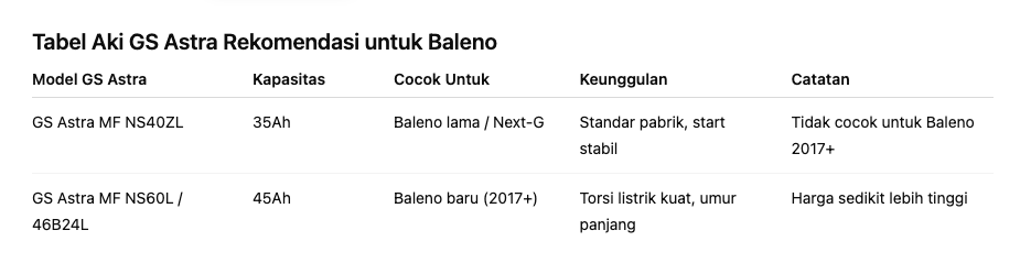 Baleno generasi ini masih pakai sistem yang simpel. Nggak perlu kapasitas besar. Tapi tetap, pakai aki berkualitas seperti GS Astra itu bikin starter lebih enteng.