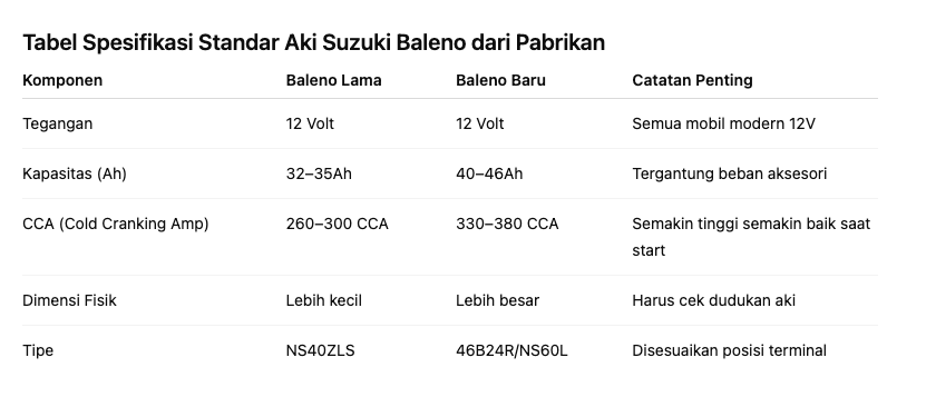 Sementara untuk Baleno Hatchback baru (2017–sekarang), kapasitas terbaik adalah 40–46Ah. Kenapa lebih besar? Karena mobil generasi baru punya lebih banyak perangkat elektronik: ABS, sensor-sensor modern, AC digital, head unit besar, sampai fitur keyless. Semua itu butuh suplai yang stabil supaya nggak rewel.