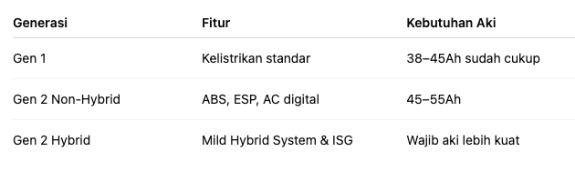 Oke, jawaban singkatnya: biasanya antara 35–55 Ah, tergantung generasi dan tambahan kelistrikan.
