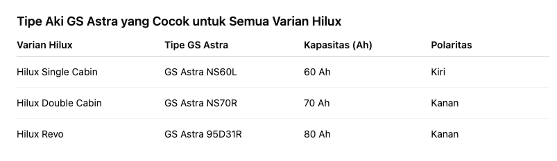 Kami pribadi pakai aki GS Astra NS70 waktu dulu masih pakai Hilux 2.4, dan hasilnya stabil banget, starter langsung nyala halus meskipun mobil udah parkir 3–4 hari.